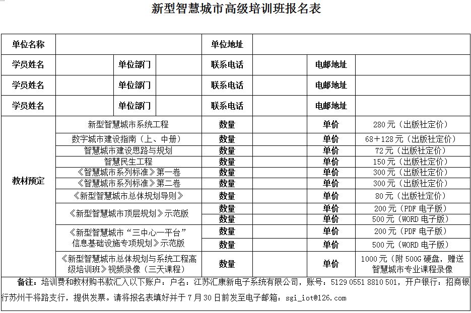 注:参加培训者请于7月30日前报名,具体报到事项另行通知,各有关单位或个人请将报名表填完发送至电子邮箱:sgi_iot@126.com