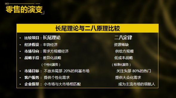 除此之外,在消费者高效、个性、独特的消费需求的场景下,长尾理论是最能代表大数据优势的一个理论体系。具有现实意义。