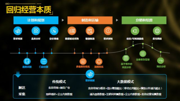 这是我们服装企业的整个经营链路,基于大数据模式的应用和方法正在影响和改变经营链中的每一个环节;